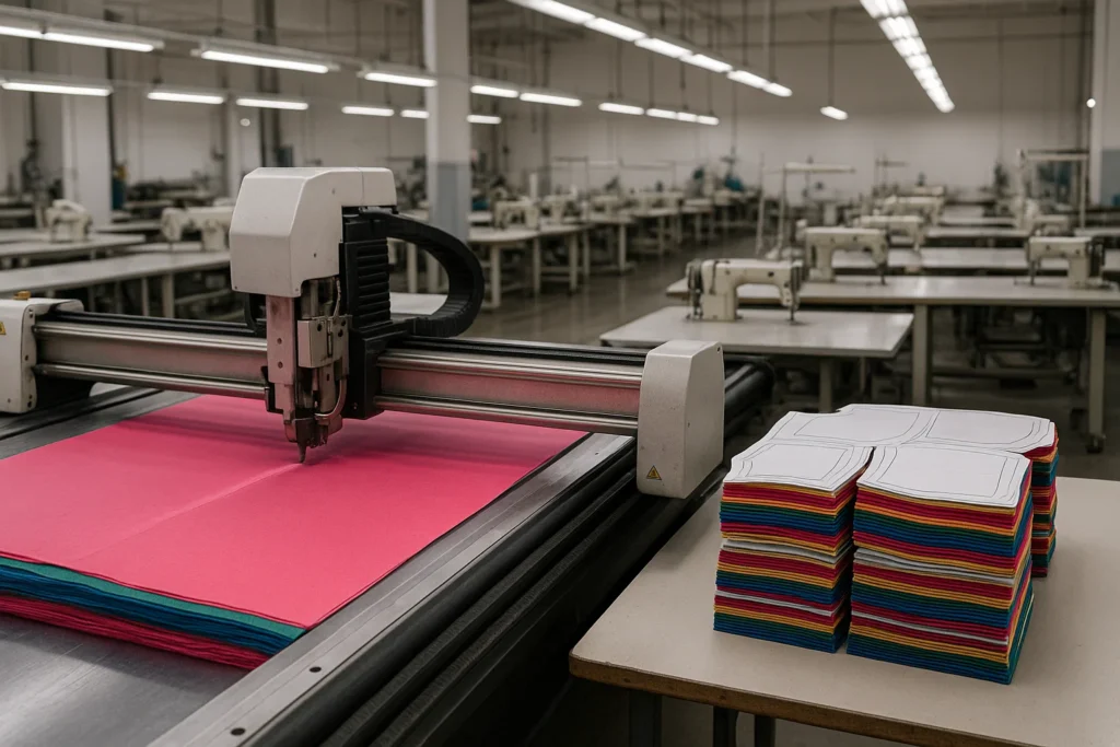 - برش (Cutting): پارچهها به صورت چندلایه پهن شده و توسط دستگاههای برش اتوماتیک یا دستی بر اساس الگوها برش میخورند.