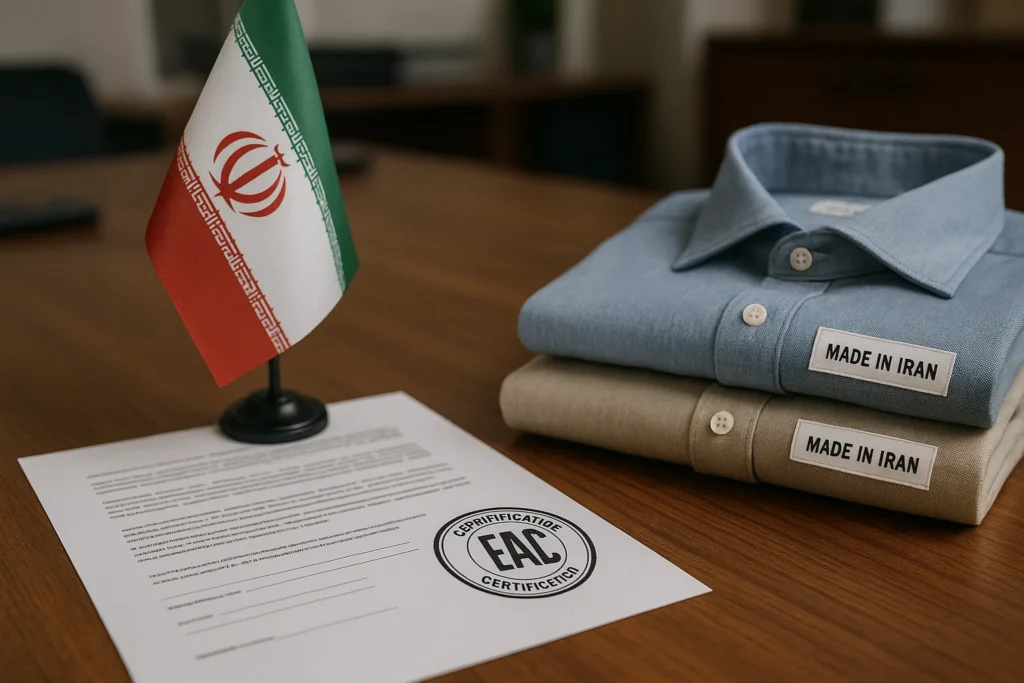 - گواهینامه انطباق اوراسیا (EAC Mark): این مهمترین و حیاتیترین مجوز برای ورود پوشاک به روسیه است. این گواهینامه نشان میدهد که محصول شما با مقررات فنی اتحادیه اقتصادی اوراسیا (شامل روسیه، بلاروس، قزاقستان، ارمنستان و قرقیزستان) مطابقت دارد. بدون داشتن این نشان بر روی محصول و ارائه گواهی آن، ترخیص کالا از گمرک روسیه غیرممکن است. برای دریافت آن باید از طریق شرکتهای بازرسی مورد تأیید اقدام کنید.
