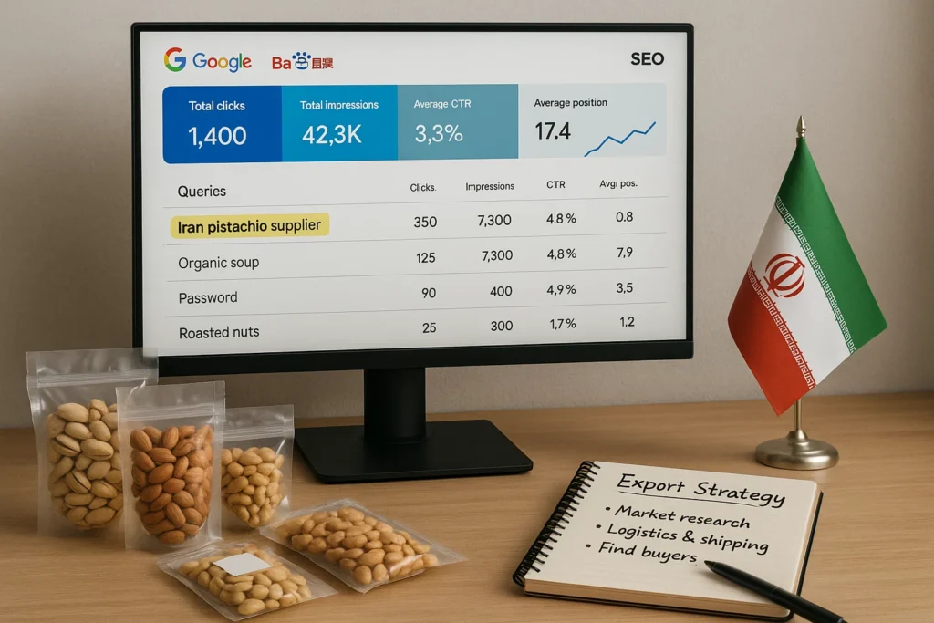• سئو (SEO) چندزبانه تخصصی: مهم‌تر از داشتن سایت، دیده شدن آن است. با بهینه‌سازی سایت برای موتورهای جستجوی جهانی (گوگل) و چینی (Baidu)، کاری می‌کنید که وقتی یک تاجر چینی به دنبال “خرید پسته ایرانی” است، سایت شما را در رتبه اول ببیند. این قدرتمندترین روش بازاریابی بلندمدت است.