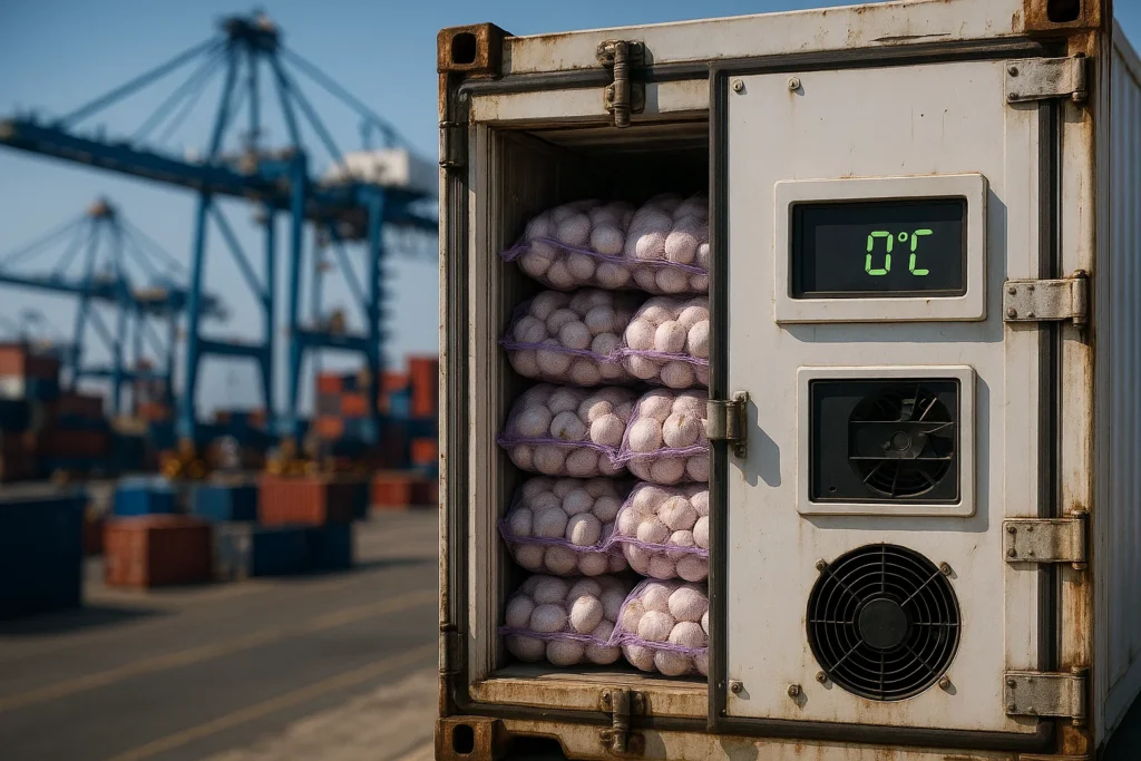 - دمای حمل: دمای ایدهآل برای حمل سیر خشک بین ۰ تا ۱ درجه سانتیگراد با رطوبت نسبی ۶۵-۷۰ درصد است. برای این منظور، استفاده از کانتینرهای یخچالی (Reefer Containers) یا کانتینرهای دارای تهویه (Ventilated Containers) ضروری است.