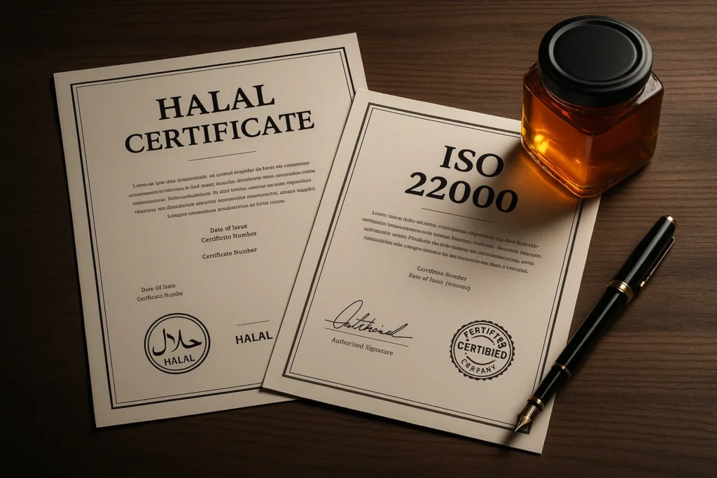 - گواهی حلال (Halal Certificate): برای ورود به بازارهای اسلامی، خصوصاً امارات، الزامی است. این گواهی نشان میدهد که محصول طبق ضوابط اسلامی تولید شده است.