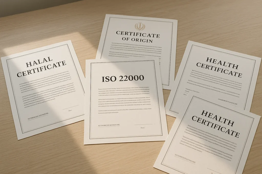 - دریافت مجوزها: اخذ گواهی استاندارد، بهداشت، حلال و مبدا.