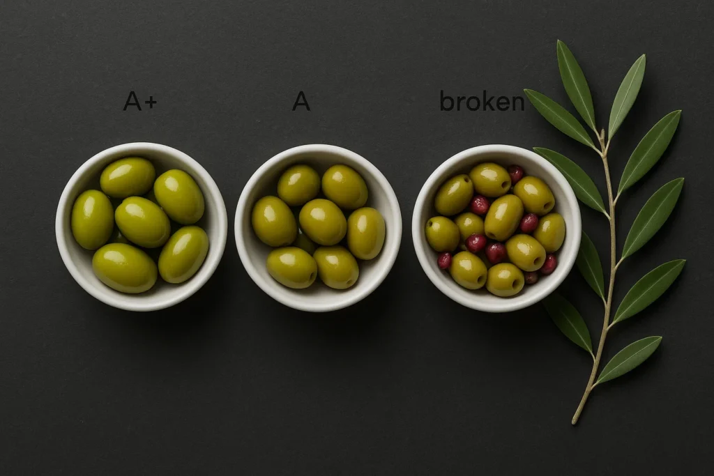زیتون صادراتی بر اساس کیفیت، اندازه و فرآوری دستهبندی میشود: