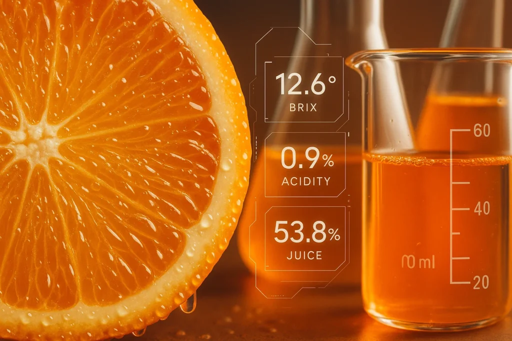 - بریکس (Brix): میزان قند محلول در آب میوه را نشان میدهد. بریکس بالاتر به معنی شیرینتر بودن پرتقال است. (معمولاً بین ۱۲ تا ۱۵)