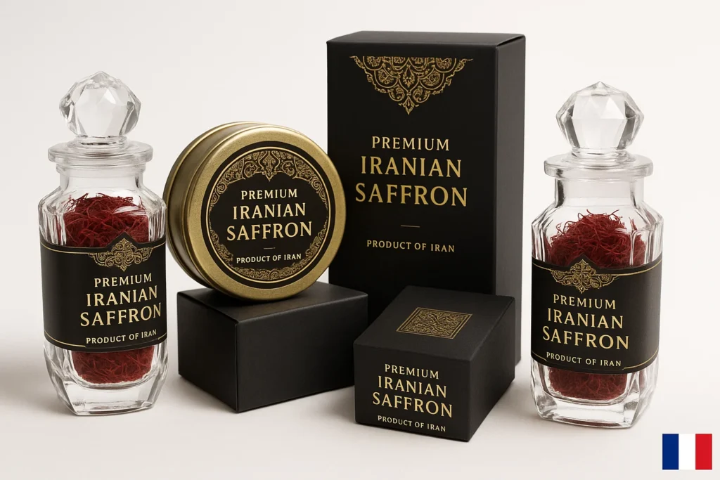- اطلاعات روی برچسب (به فرانسوی): برچسبگذاری باید طبق قوانین اتحادیه اروپا باشد: نام محصول (Safran)، گرید کیفی (مثلاً Catégorie I – ISO 3632)، وزن خالص، تاریخ انقضا، کشور مبدا (Iran) و اطلاعات تماس شما.