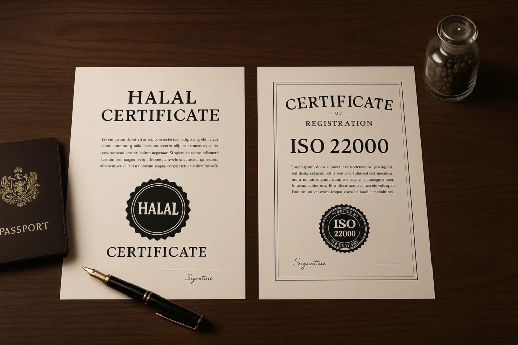 - گواهی حلال (Halal Certificate): برای ورود به بازارهای اسلامی مانند دبی، این گواهی بسیار ضروری است. این گواهی نشان میدهد که محصول طبق ضوابط شرع اسلام تولید و فرآوری شده است.