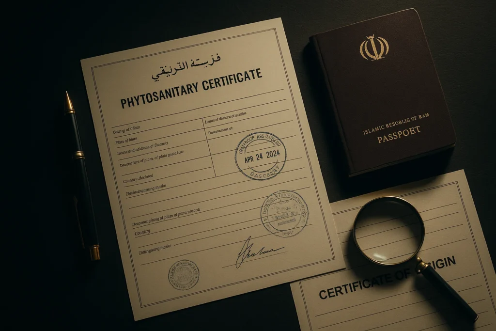- گواهی بهداشت و قرنطینه نباتی (Phytosanitary Certificate): این گواهی توسط سازمان حفظ نباتات صادر میشود و سلامت محصول از آفات و بیماریها را تایید میکند. این یکی از مهمترین اسناد برای صادرات محصولات کشاورزی است.